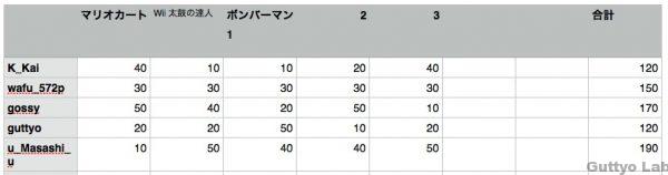 マリオカート、太鼓の達人、ボンバーマン3戦が終わったときの成績表です。iPadのNumbersで作りました。現状5位の方が最後で1位をとっても優勝できないことが判明したので、最後の試合は1位は100点ゲットということでルール改正しましたw ということは、今までの成績は全く関係なくこのゲームで勝った人がマジトラゲットということになります^^