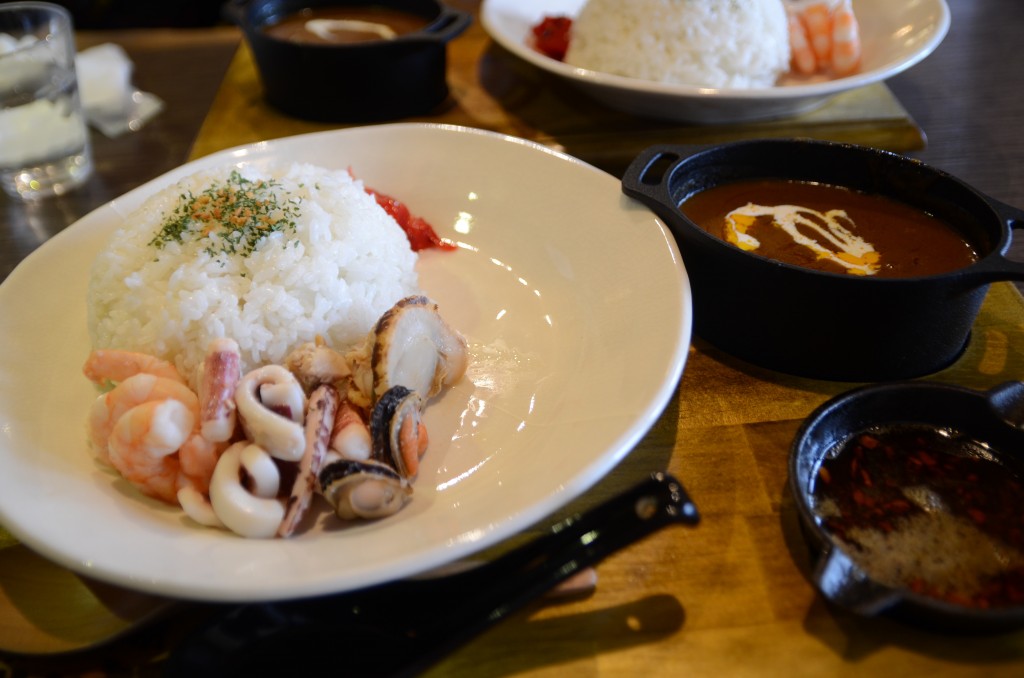 ベースはシーフードカレーですがただのシーフードカレーじゃありません。辛さは2段階くらい選べたと思います。なんて言っても美味いのが特製ホットエビオイルソース。
