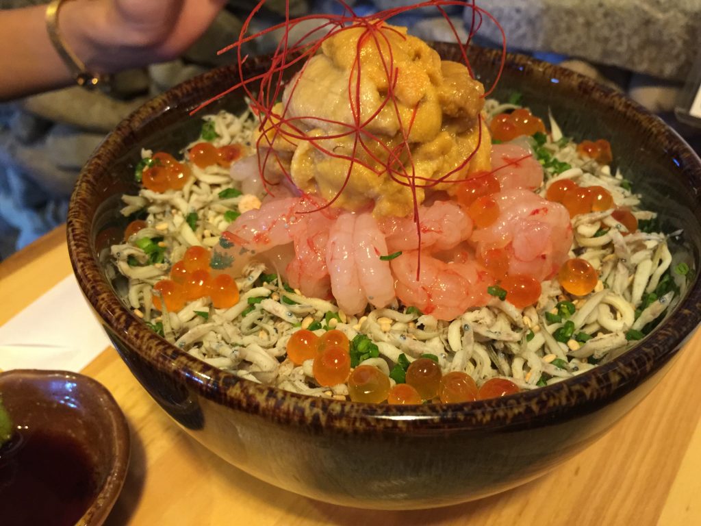 小女子丼+イカ+海老+うに=海鮮前浜ヤン衆丼です。