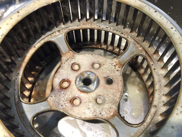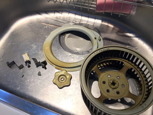 今回は換気扇のファンは噴霧+少しのこすり洗いのみ、
